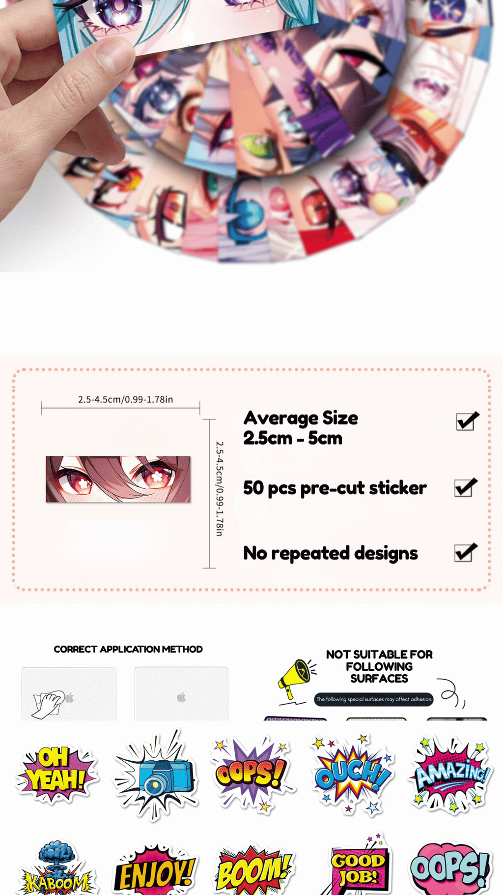 Each pack includes 50 non-repeating eye-themed stickers, curated within a cohesive and eye-catching style. Printed on waterproof PVC, these stickers are durable, easy to peel, and suitable for daily use.