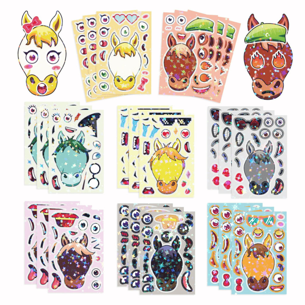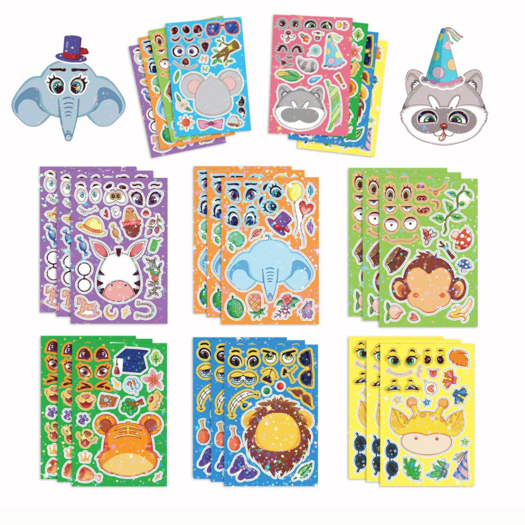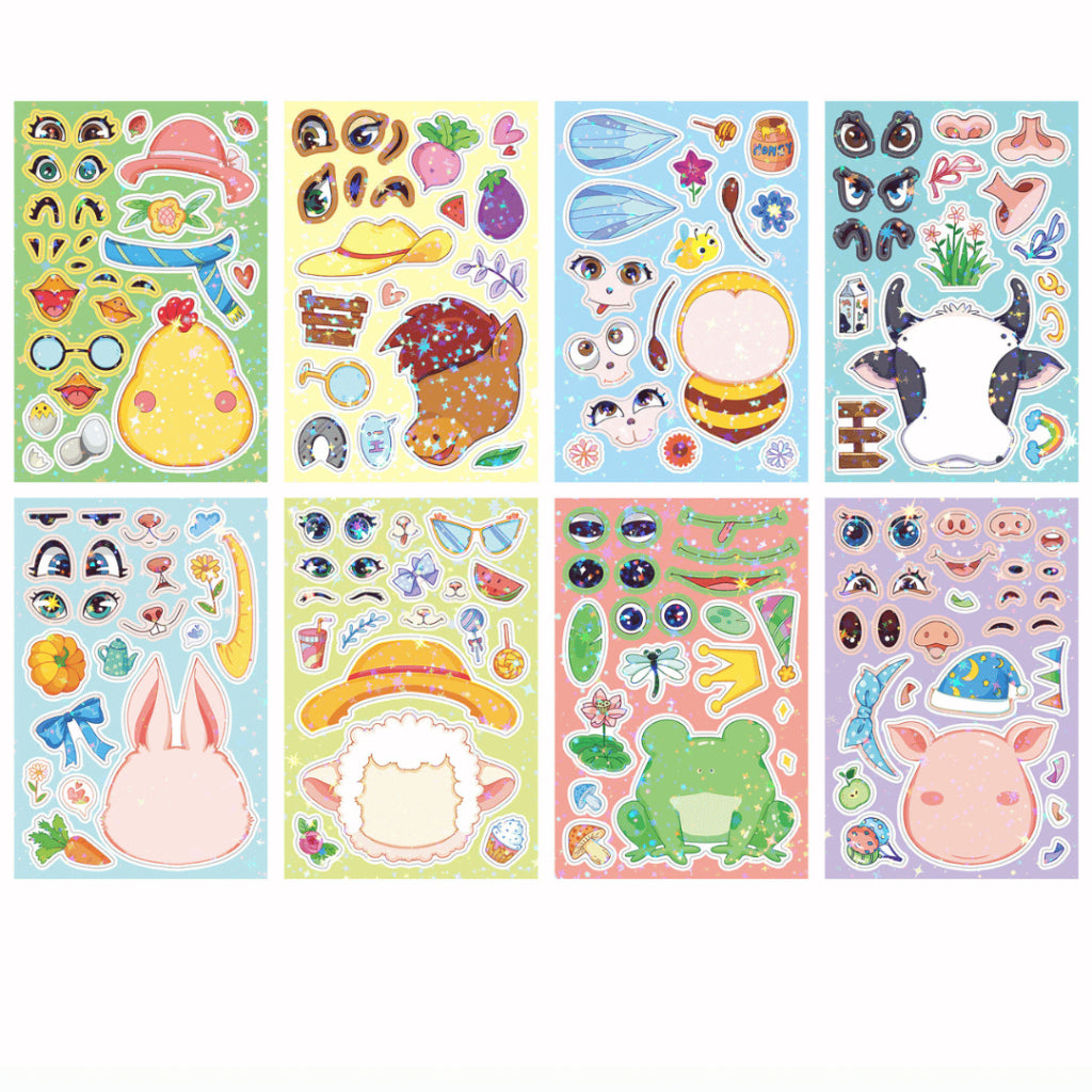 Say hello to the Change-A-Face Series – Animals, where kids can transform adorable animal characters any way they like. This 8-sheet Animal Cuteness pack lets children mix & match eyes, mouths, hats, props, and expressions to create endless funny faces.
