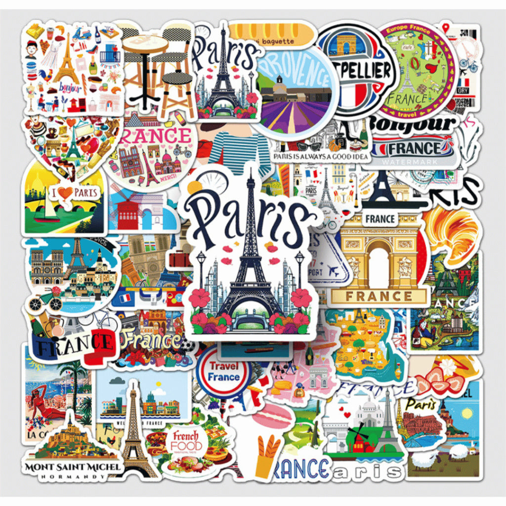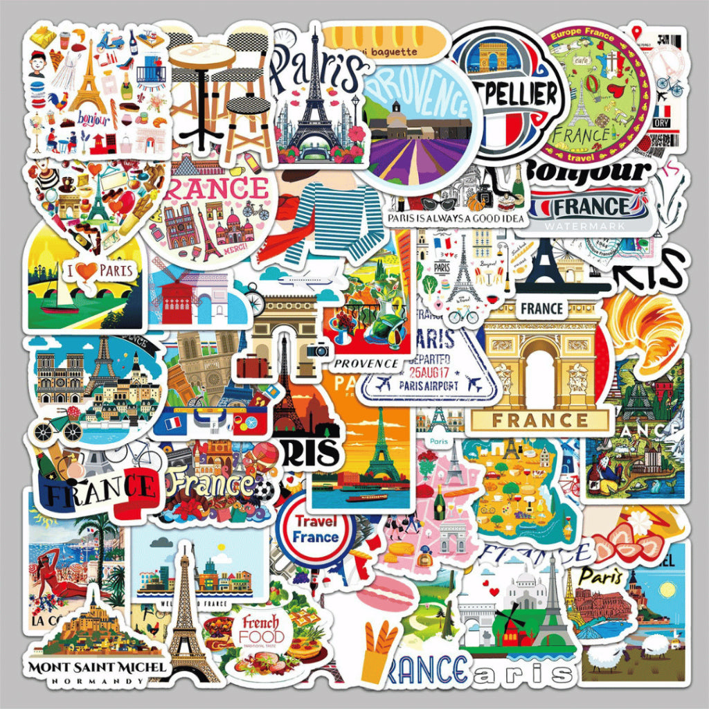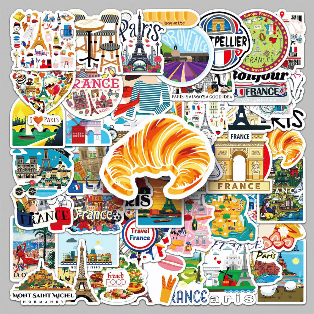Each pack includes 50 non-repeating France-themed stickers, curated within a cohesive travel and lifestyle aesthetic. Made from waterproof PVC, these stickers are durable, easy to peel, and perfect for daily use on journals, planners, laptops, and water bottles.