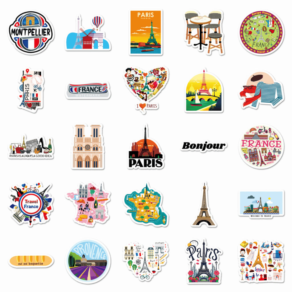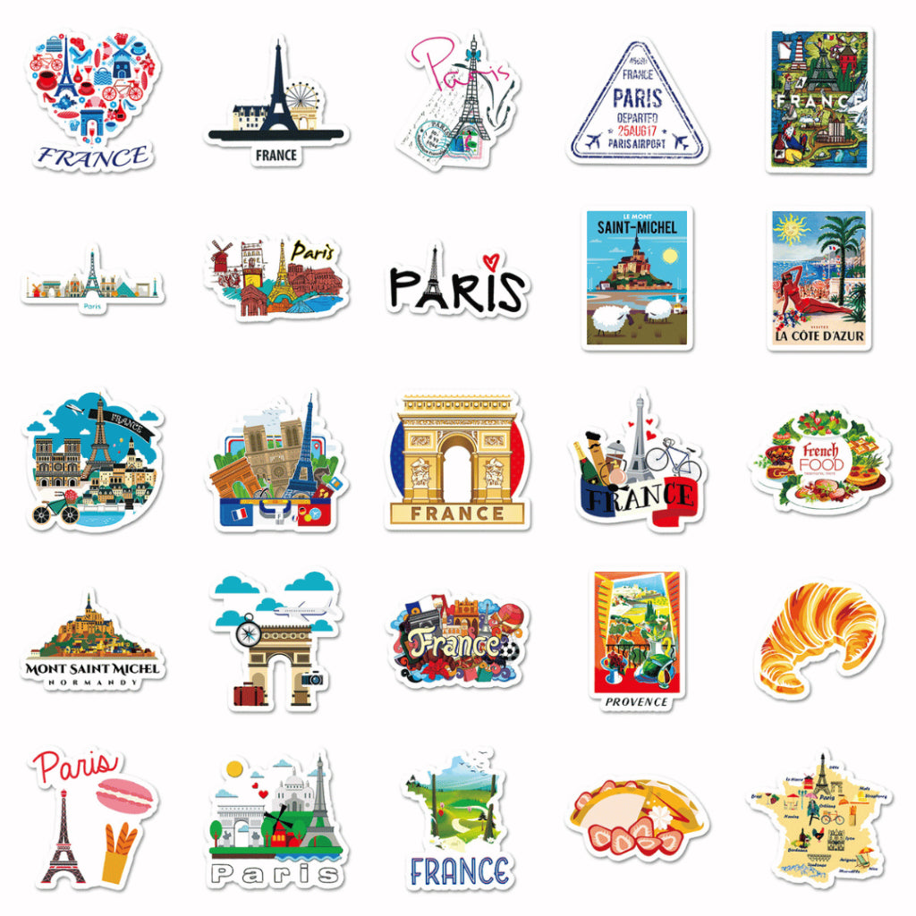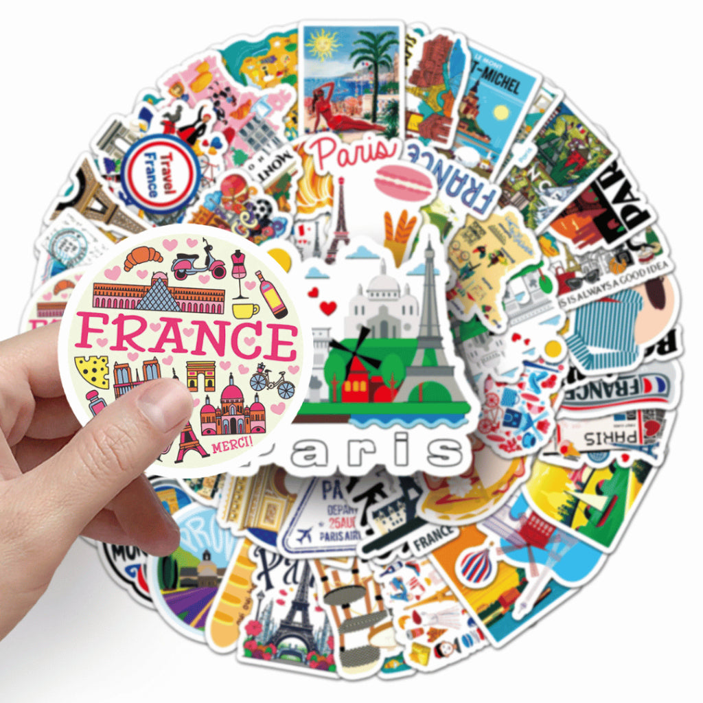 Each pack includes 50 non-repeating France-themed stickers, curated within a cohesive travel and lifestyle aesthetic. Made from waterproof PVC, these stickers are durable, easy to peel, and perfect for daily use on journals, planners, laptops, and water bottles.