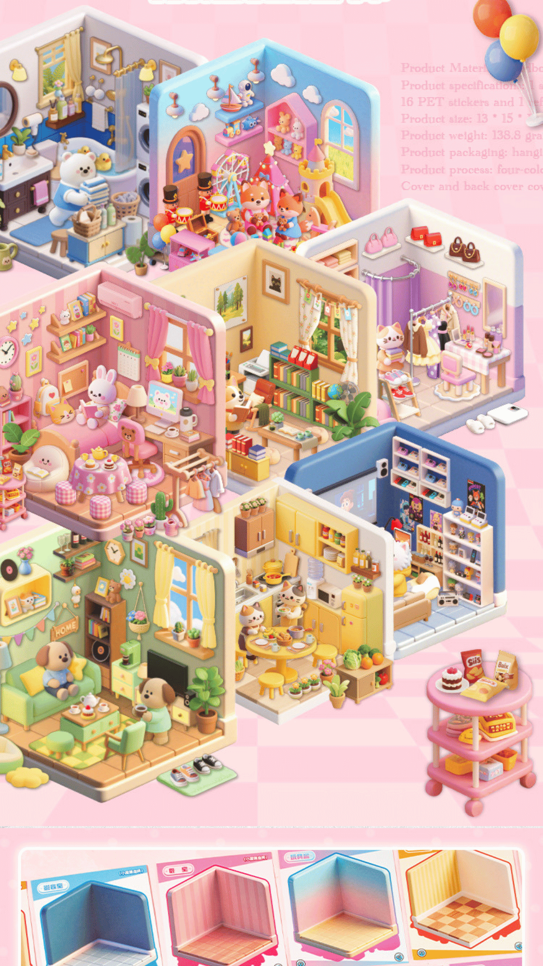 Choose from Mini Store Manager (HB 48) or Dream Room Builder (HB 49), both packed with PET stickers and realistic 3D layouts — from living rooms, cafes, and toy shops to bedrooms, book corners, and clothing boutiques.