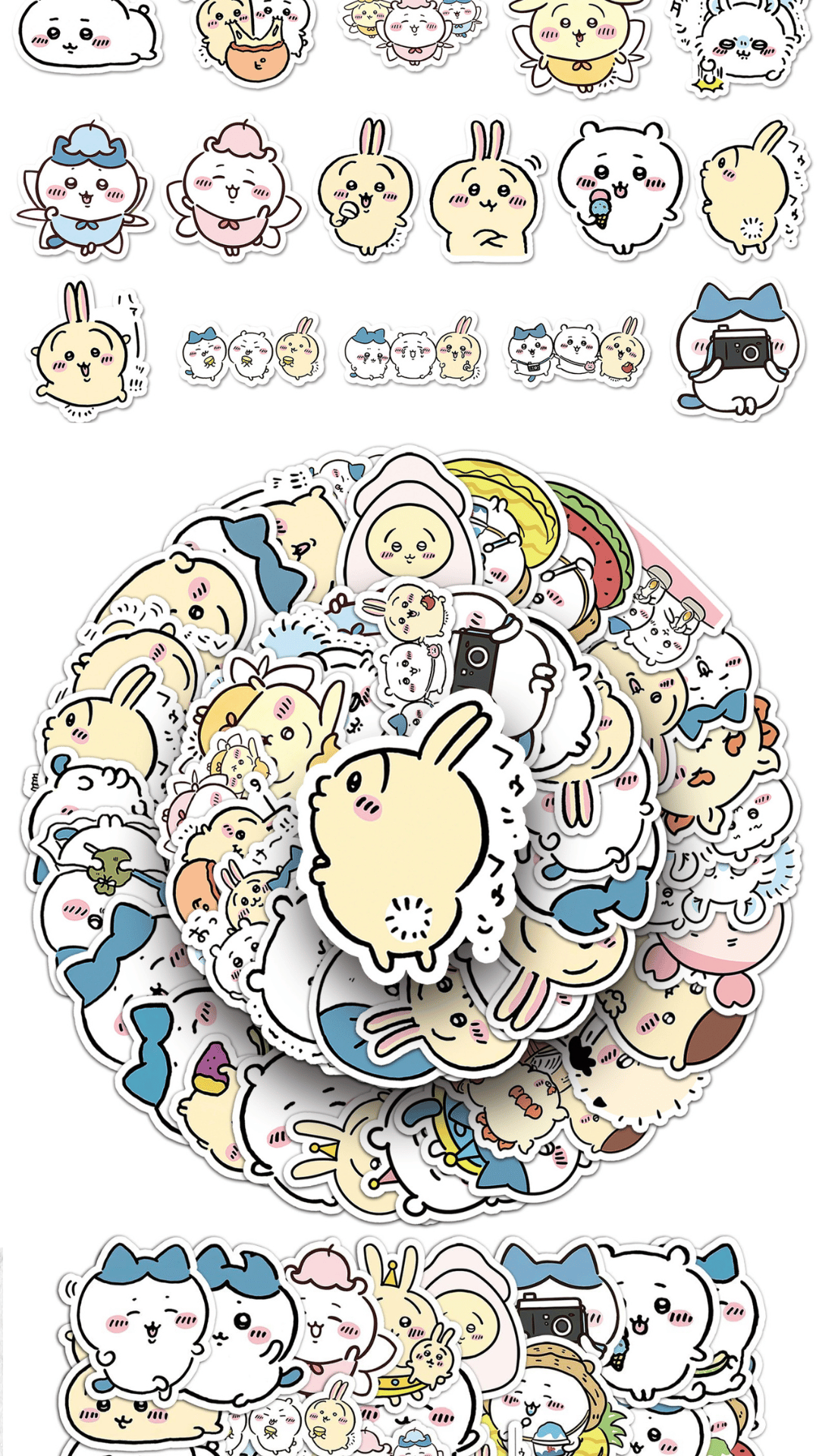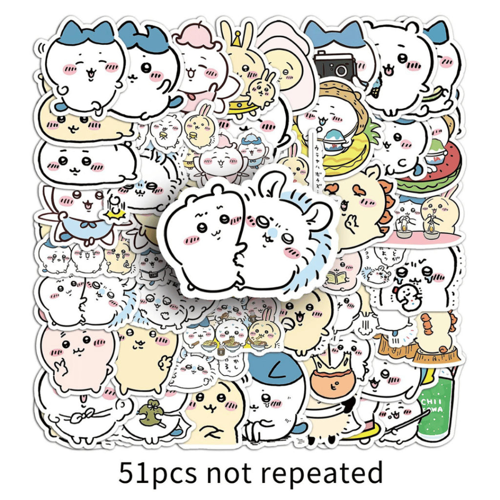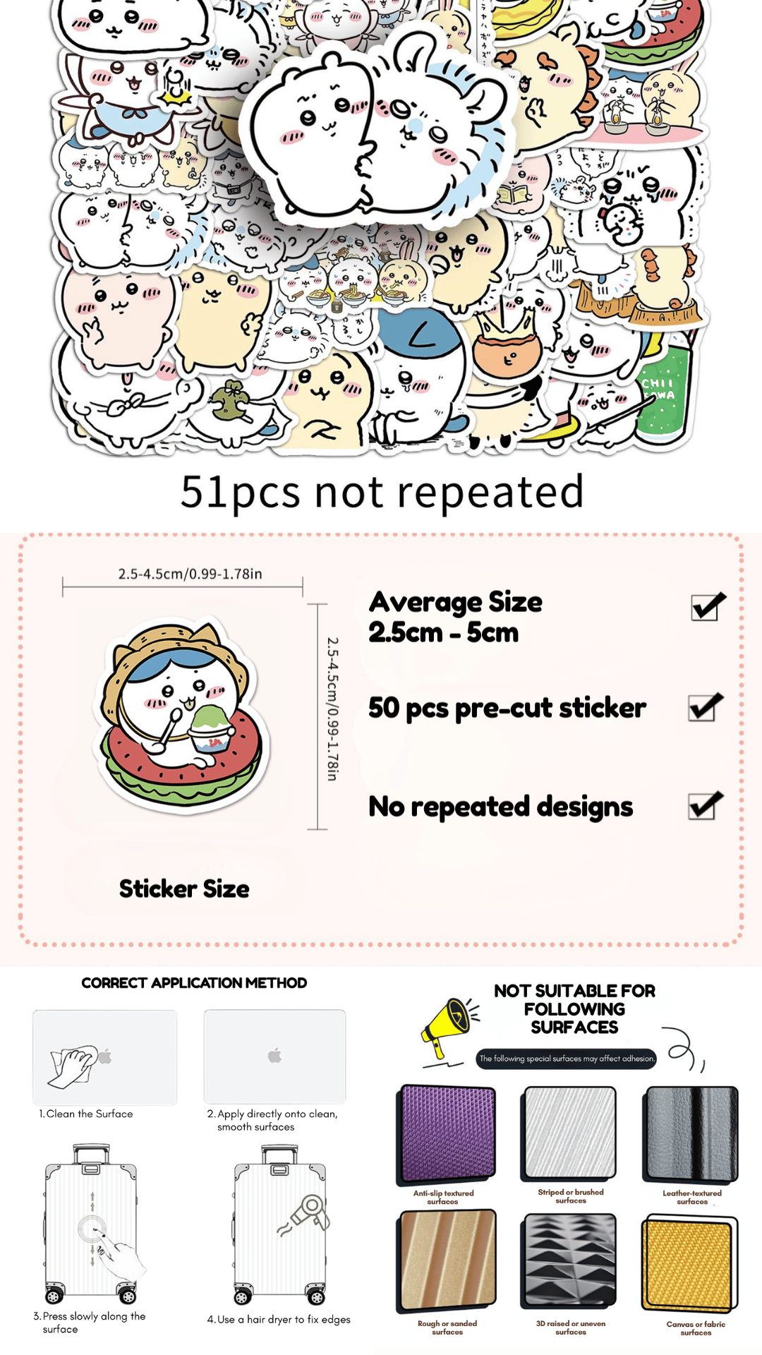 Each pack includes 50 non-repeating Chiikawa-inspired stickers, carefully curated within the same theme. Printed on waterproof PVC, these stickers are durable, easy to peel, and suitable for daily use on journals, planners, laptops, and water bottles.