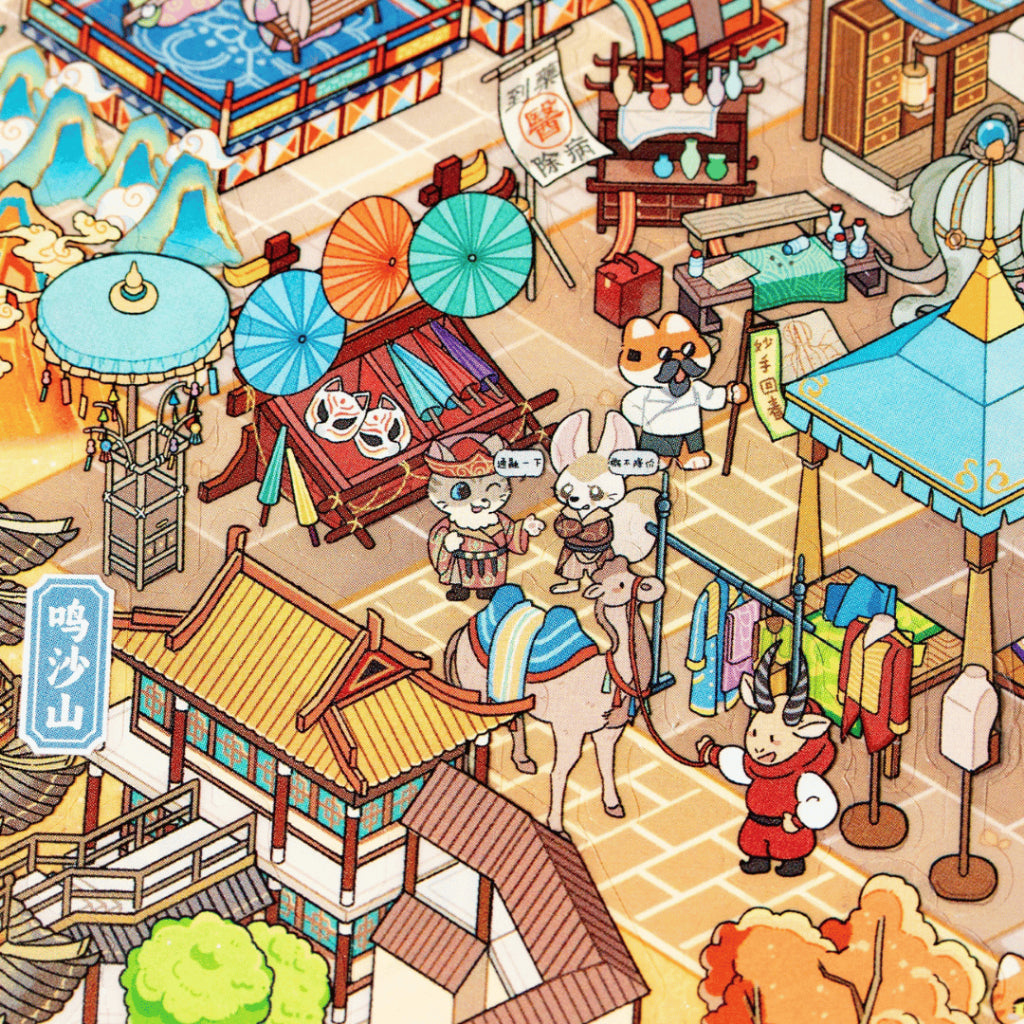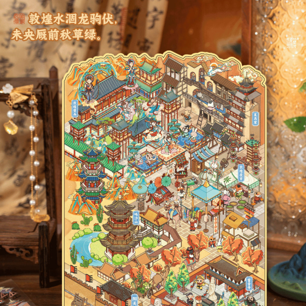 Step into a world of ancient desert legends with the Dunhuang Desert City Scene Sticker Set. Inspired by the iconic murals, temples and Silk Road architecture of Dunhuang, this set features golden pavilions, sandstone buildings, market stalls, caravans, desert plants, statues, mural fragments and glowing lantern décor — perfect for crafting an enchanting mystical city scene.