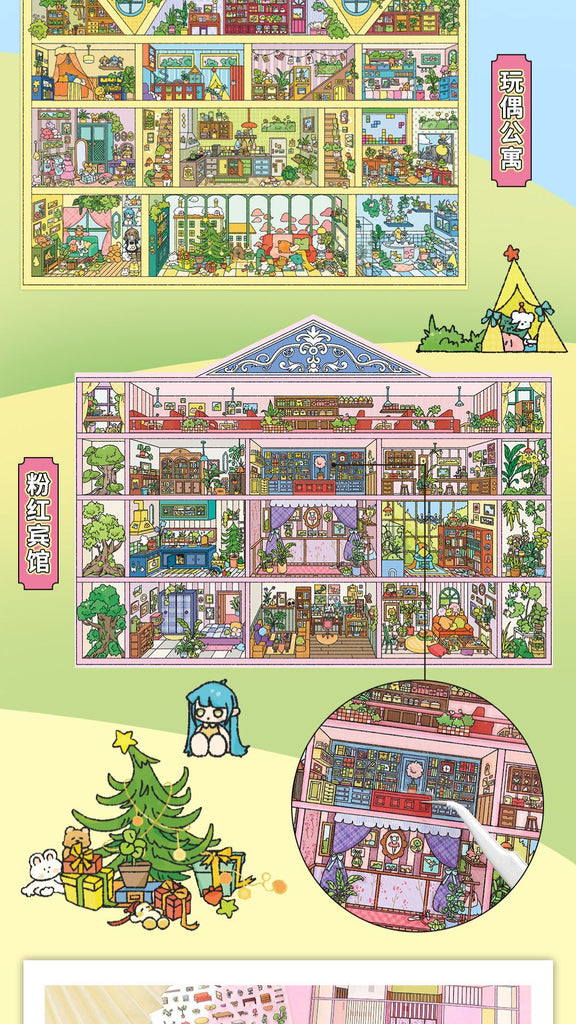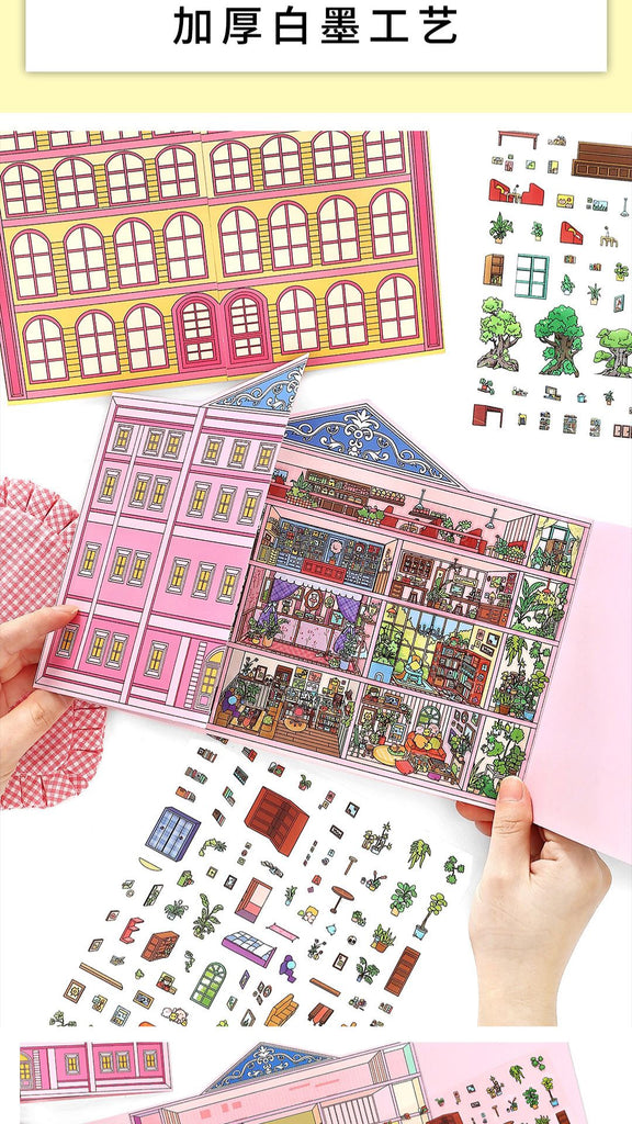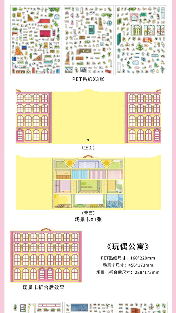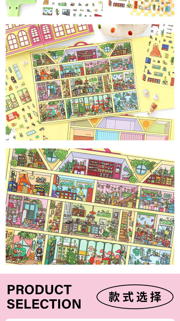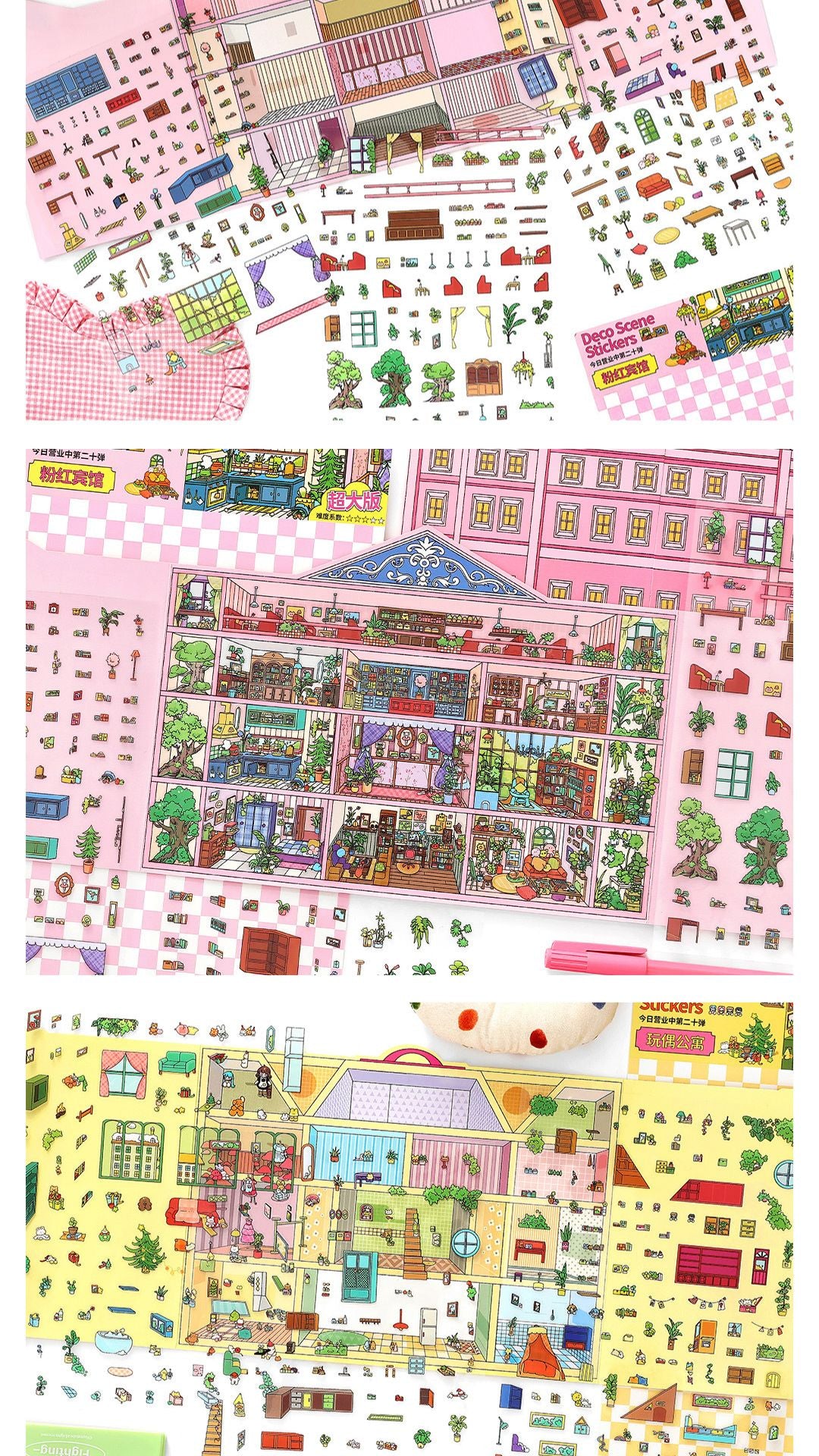 Step into your own grand dollhouse mansion with this 3D Scene Sticker Set! Featuring colorful multi-floor interiors packed with bookshelves, bedrooms, kitchens, gardens, and cozy living spaces — you can design and decorate every tiny detail just the way you like.