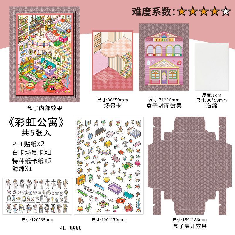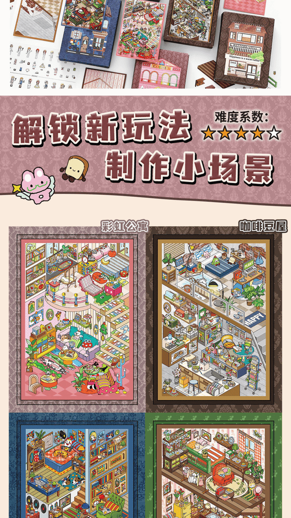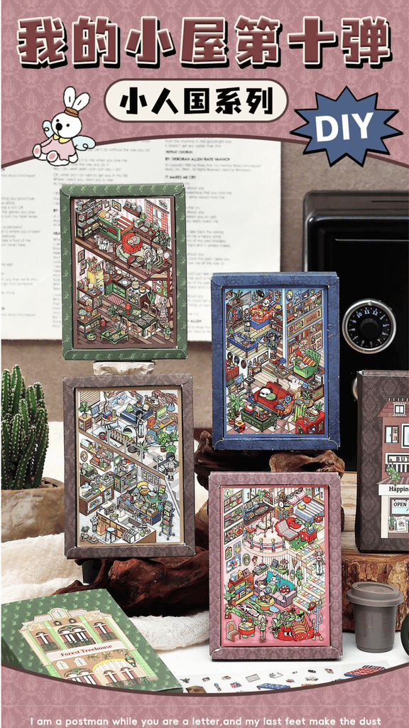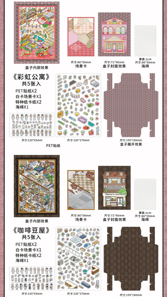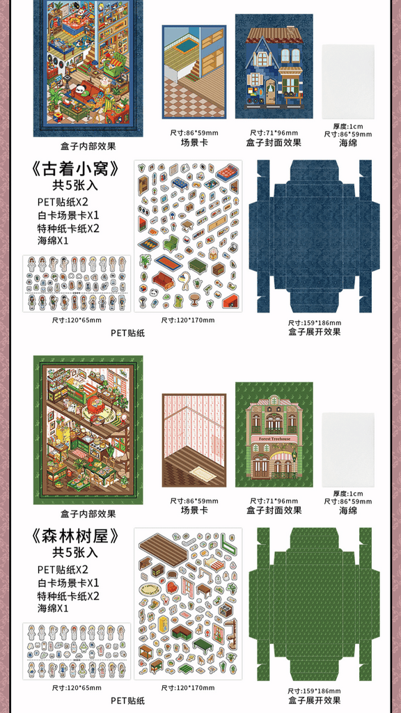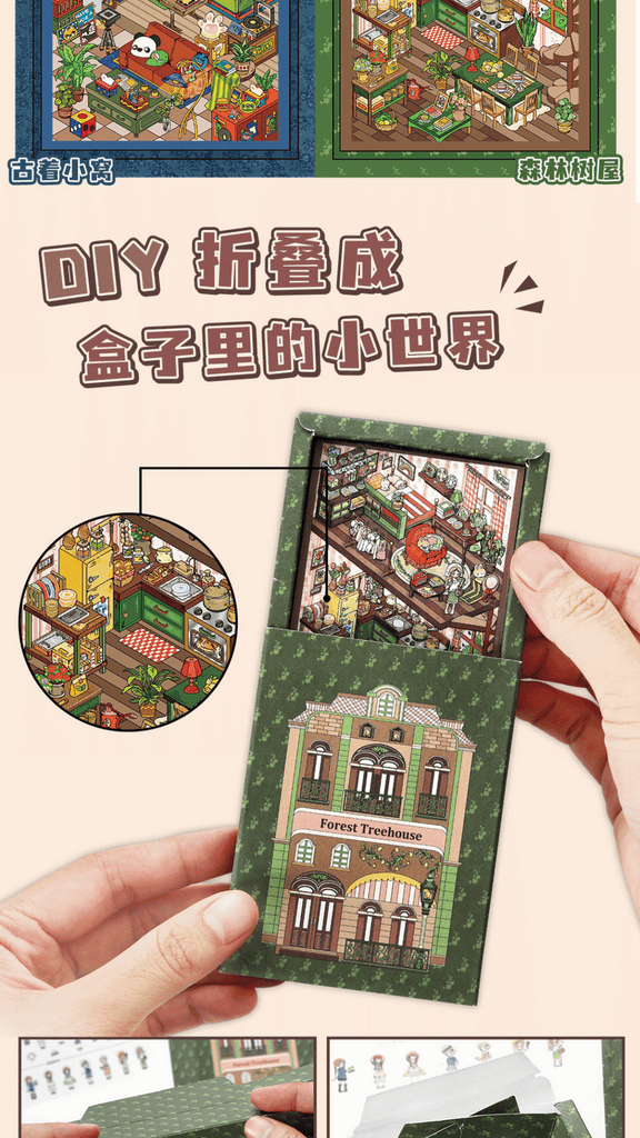 • 4x 3D landscape scene boards (Forest Treehouse, Colour Studio, Market Pantry, Cozy Room)