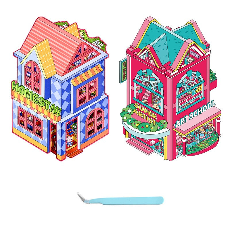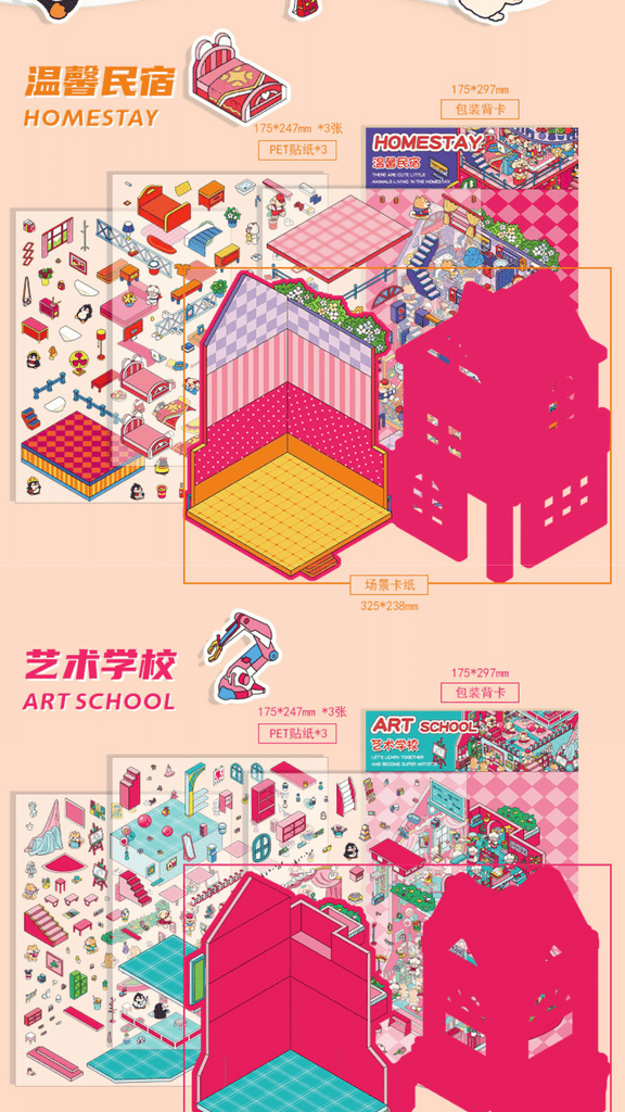 - 1 Foldable scene card (Homestay: 325 × 238mm | Art School: 339 × 240mm)