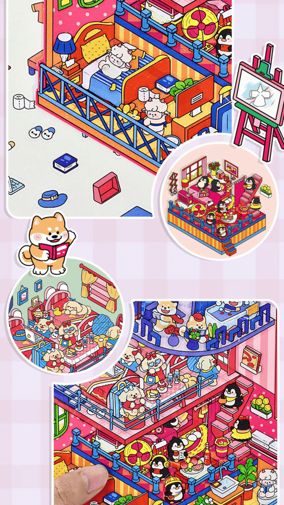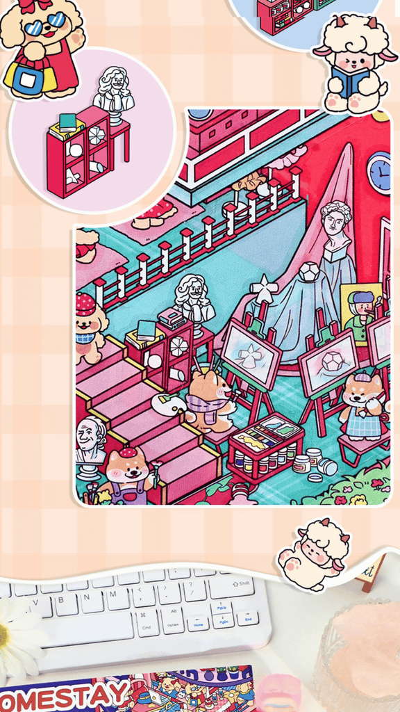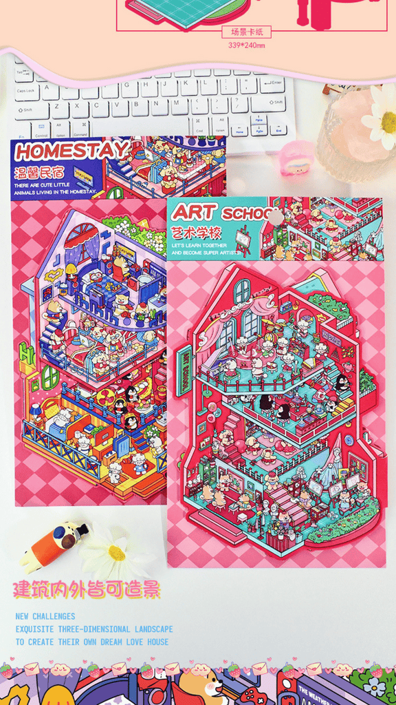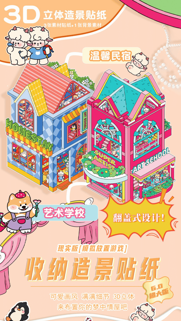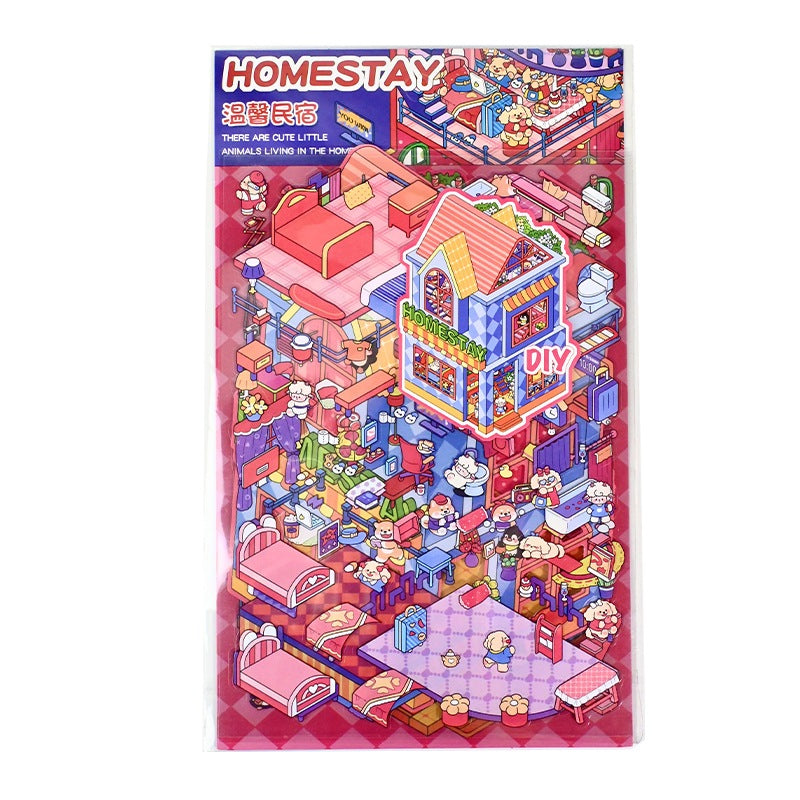 “Homestay & Art School” – a super adorable, colorful 3D landscape sticker collection where creative animals live, play, sleep, and study! Featuring two full house scenes — a cozy animal Homestay and a lively Art School — this set is perfect for anyone who loves fun, detail-packed stickers.