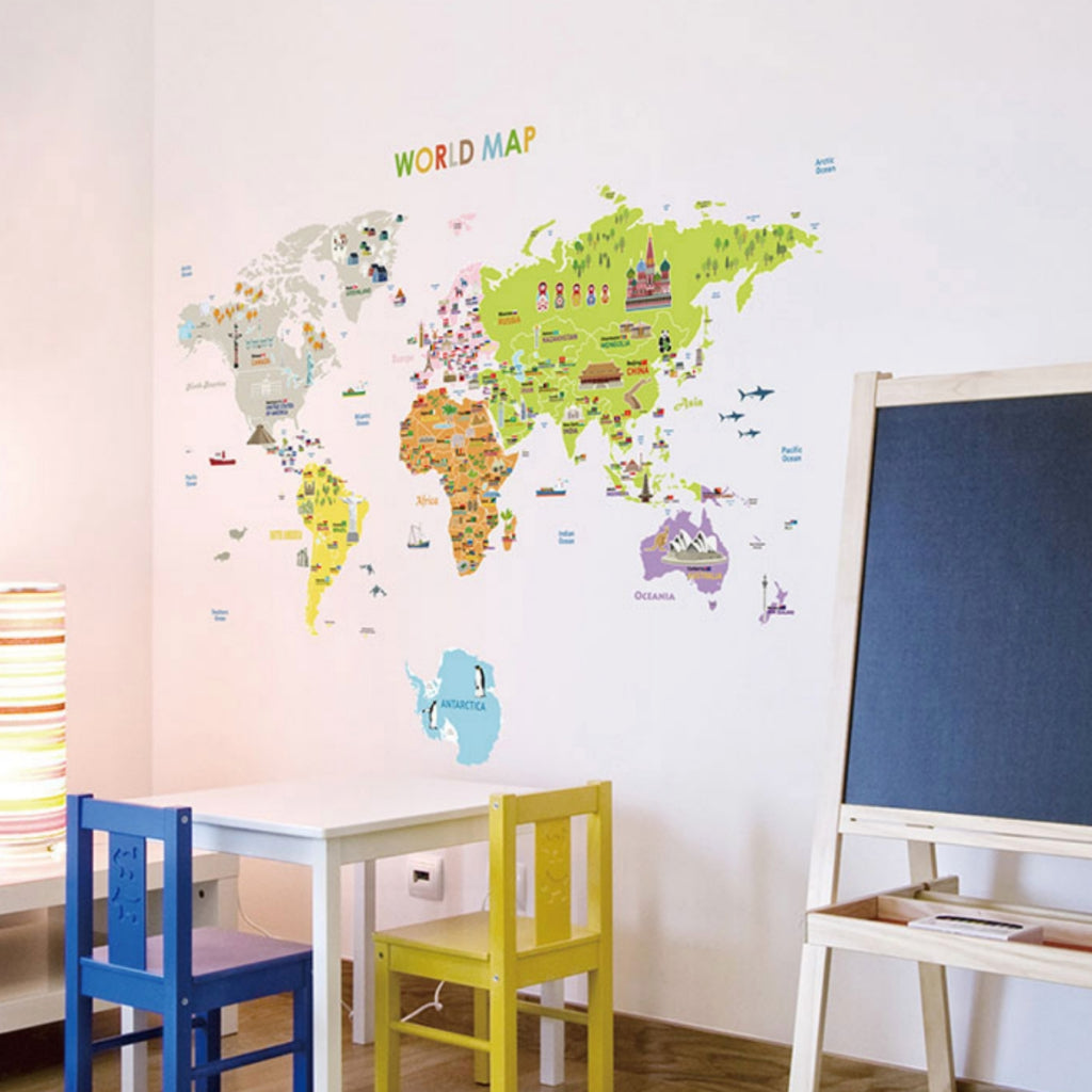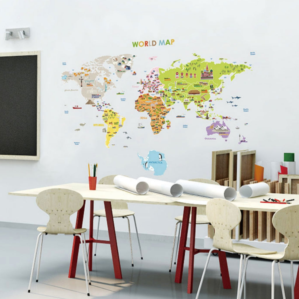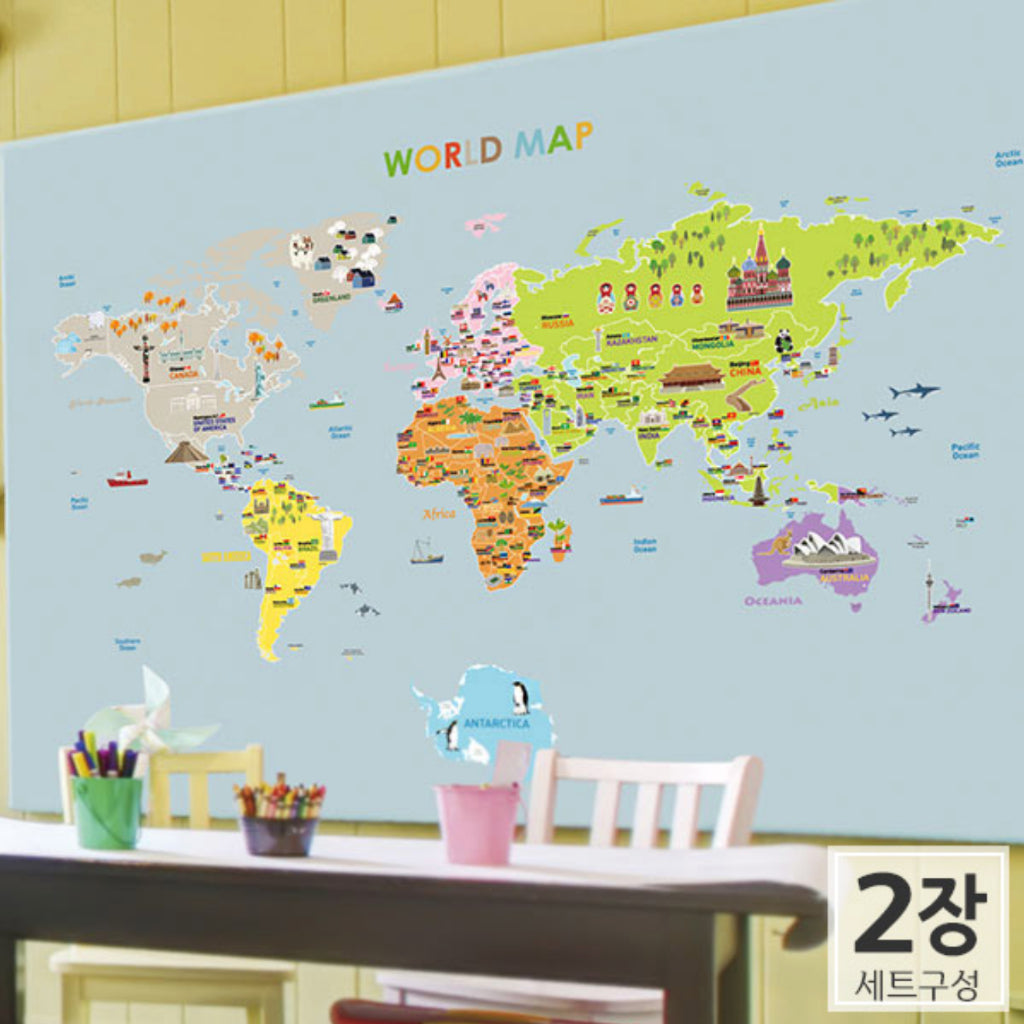Kid Character World Map 2 pcs set Wall Sticker for Modern Home Office, Nursery Room Wall Sticker, Peel and Stick Wall St