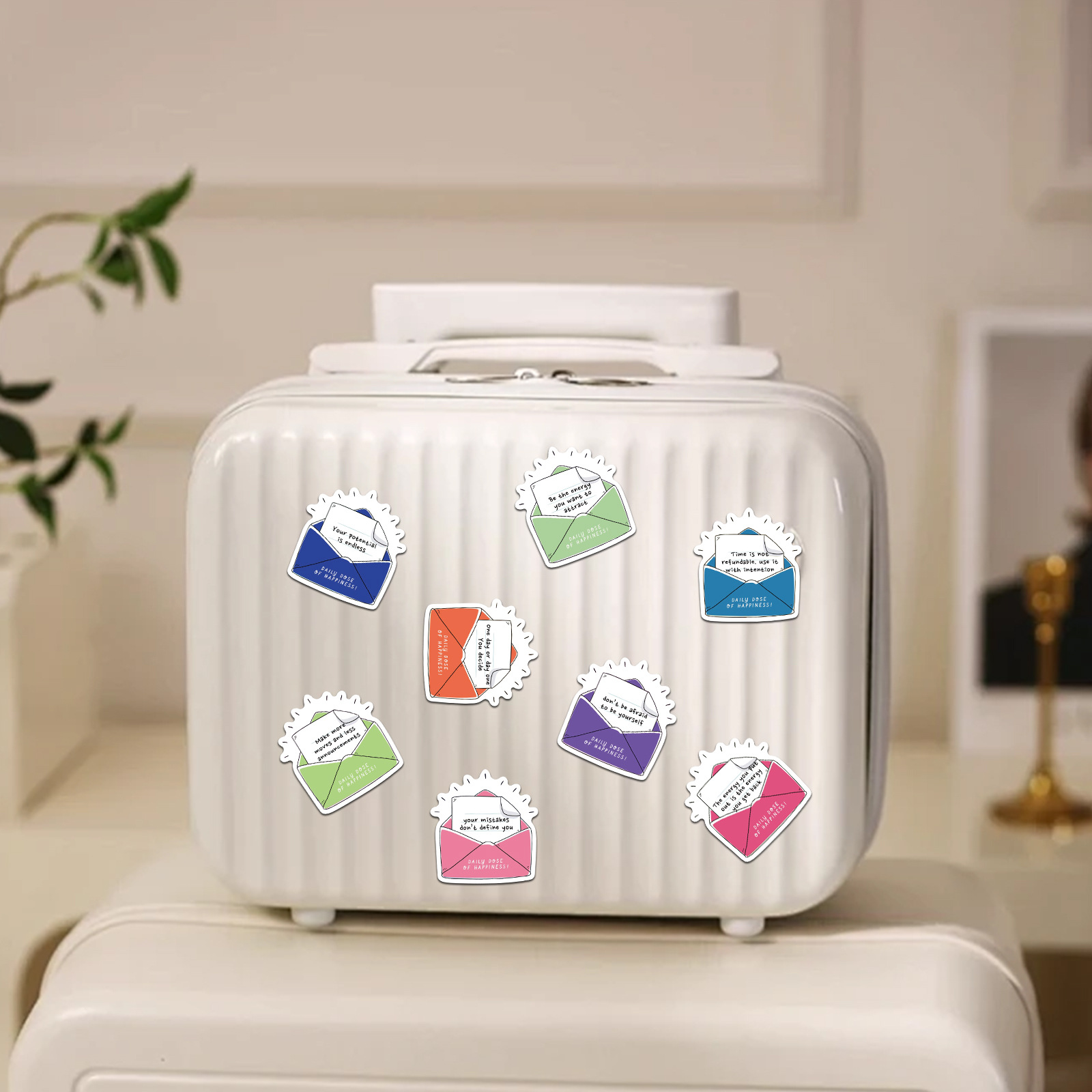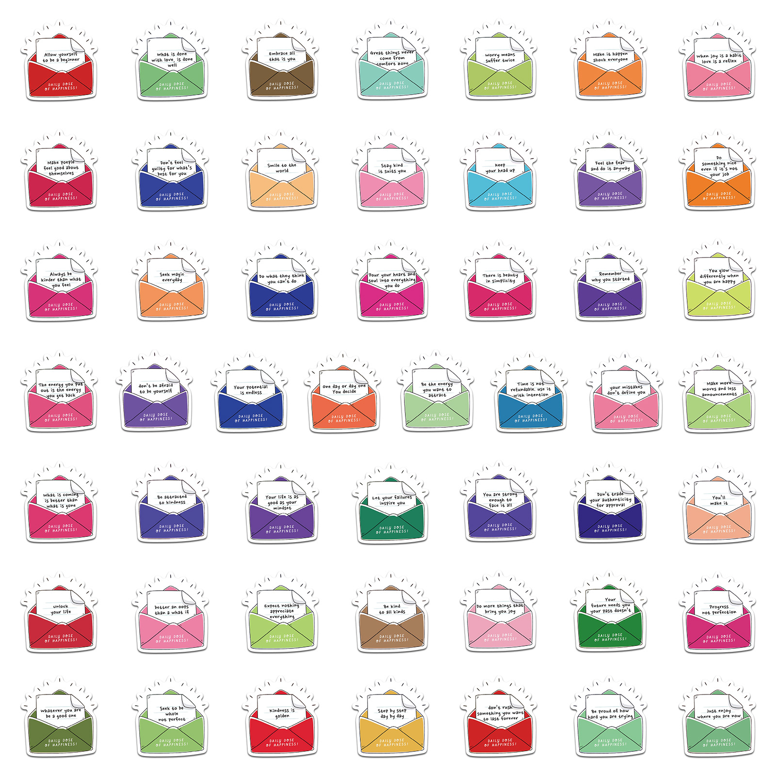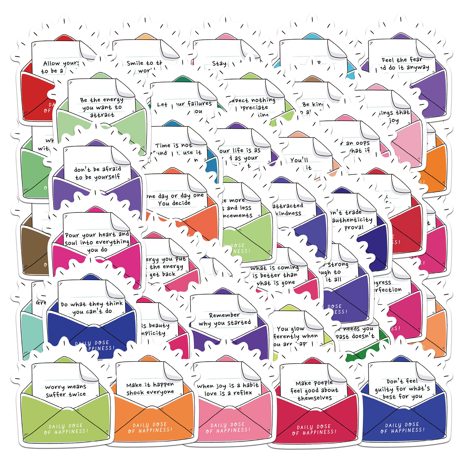 This pack of 50 Daily Dose of Happiness stickers features uplifting quotes tucked into colorful envelopes—perfect for journaling, scrapbooking, water bottles, laptops, and birthday goodie bags.