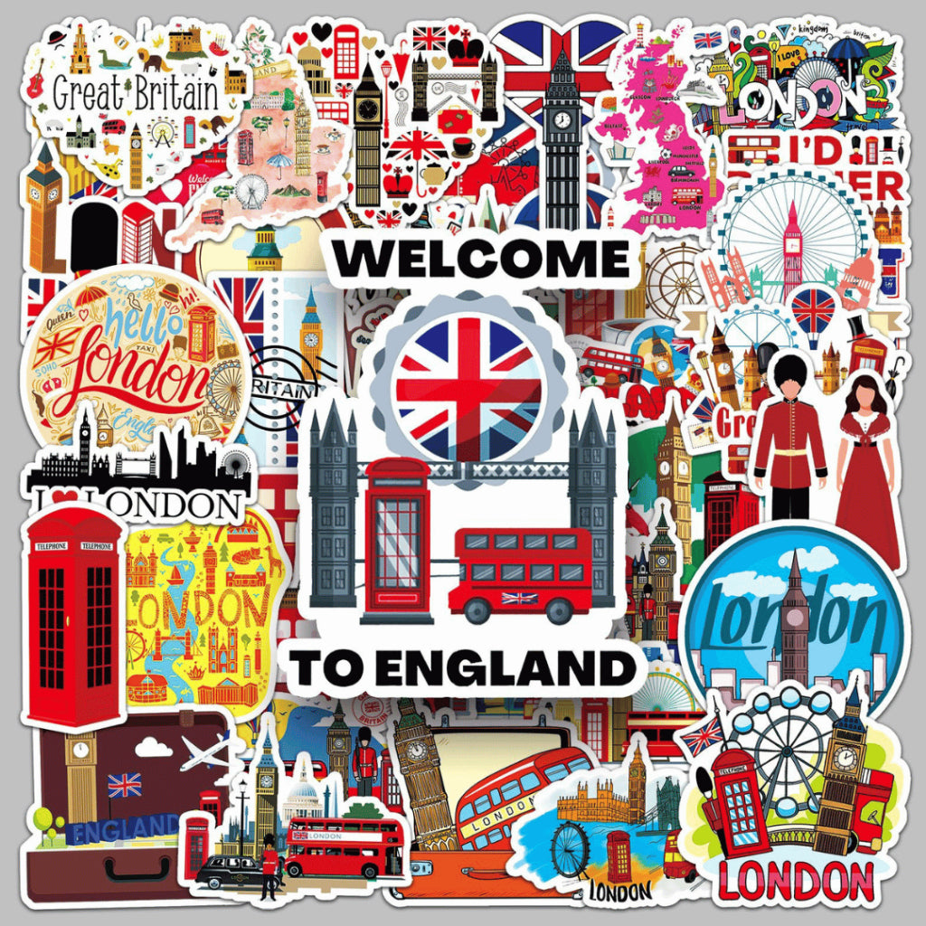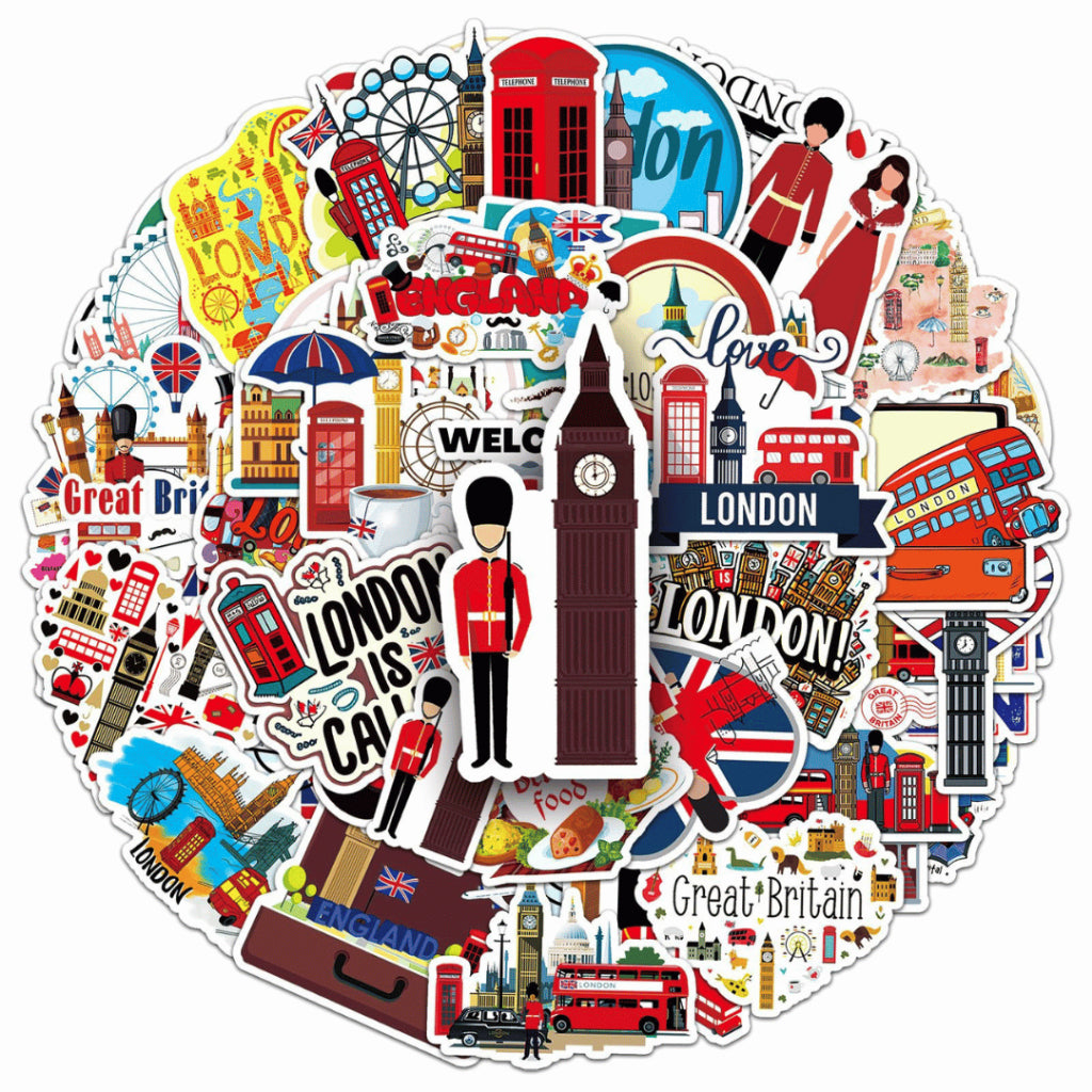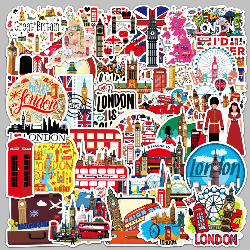Each pack includes 50 non-repeating travel-themed stickers, curated within a cohesive London-inspired aesthetic. Made from waterproof PVC, these stickers are durable, easy to peel, and perfect for daily use on journals, planners, laptops, and water bottles.
