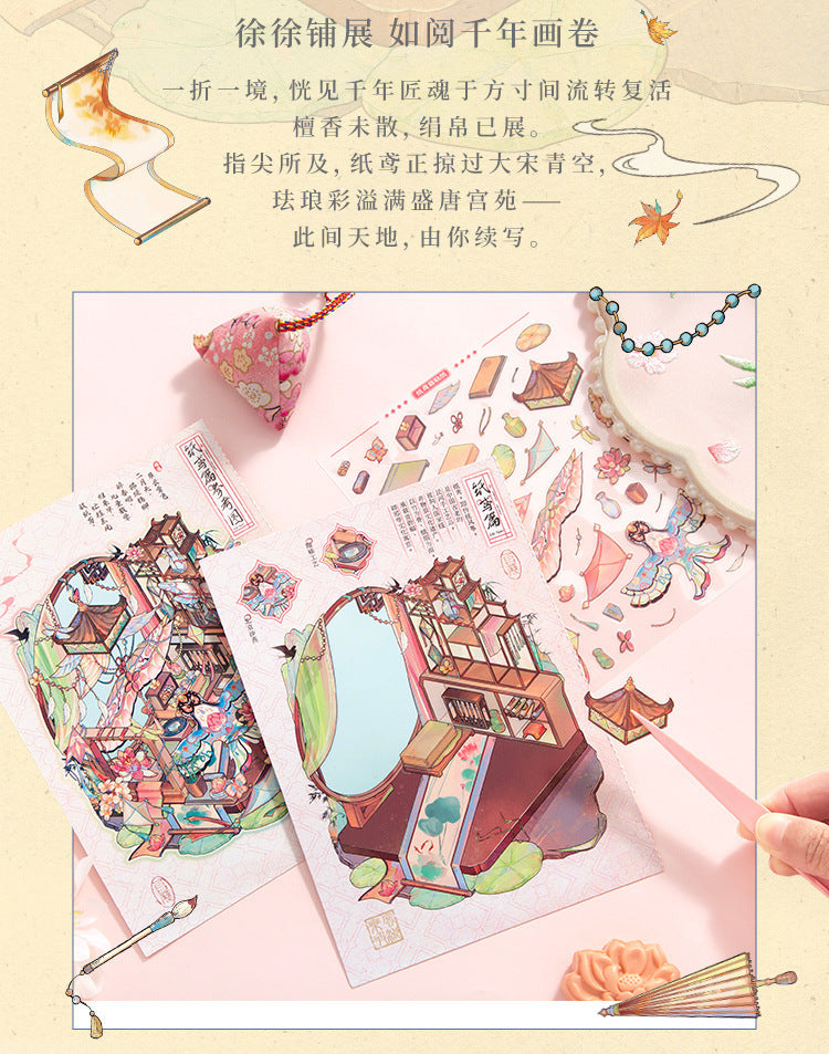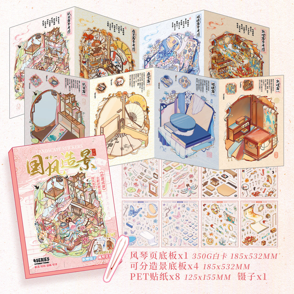 Step into a world of oriental fantasy with this Ancient Style Palace & Garden Scene Sticker Set. Each design is bursting with detail — from lotus ponds and lantern-lit pavilions to butterflies, palaces, and traditional architecture — like stepping into a painted scroll.