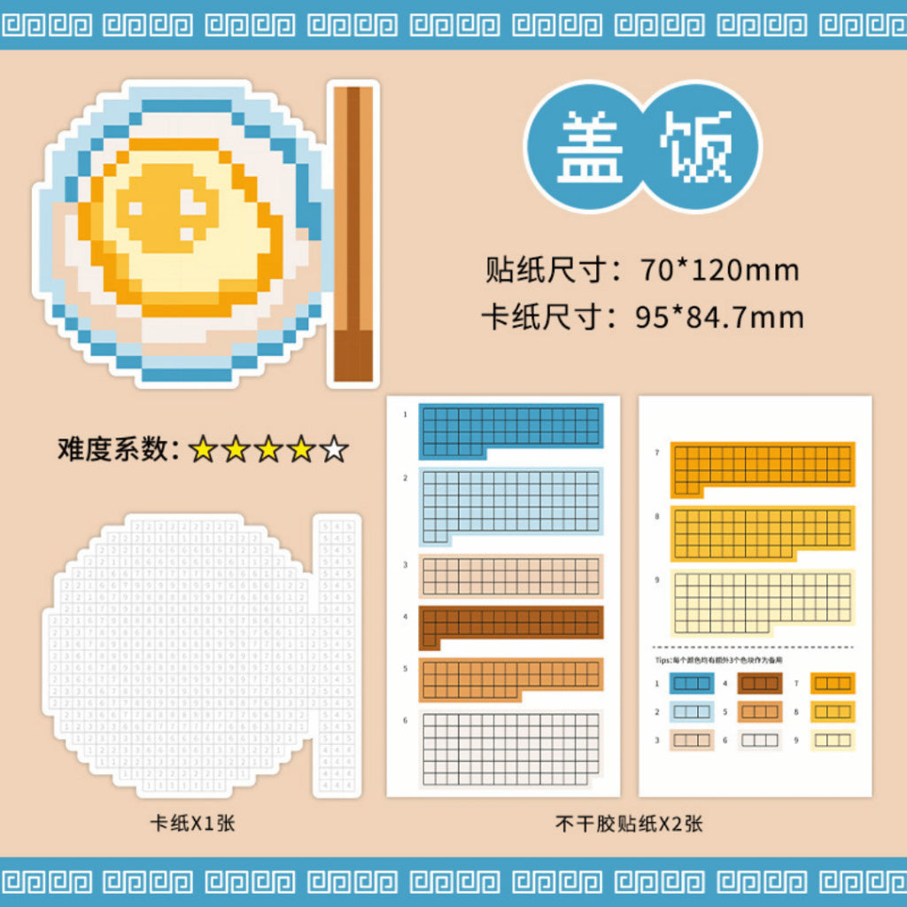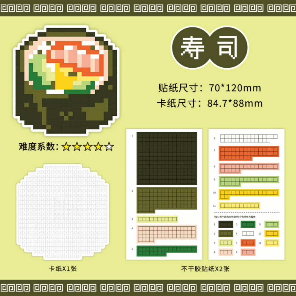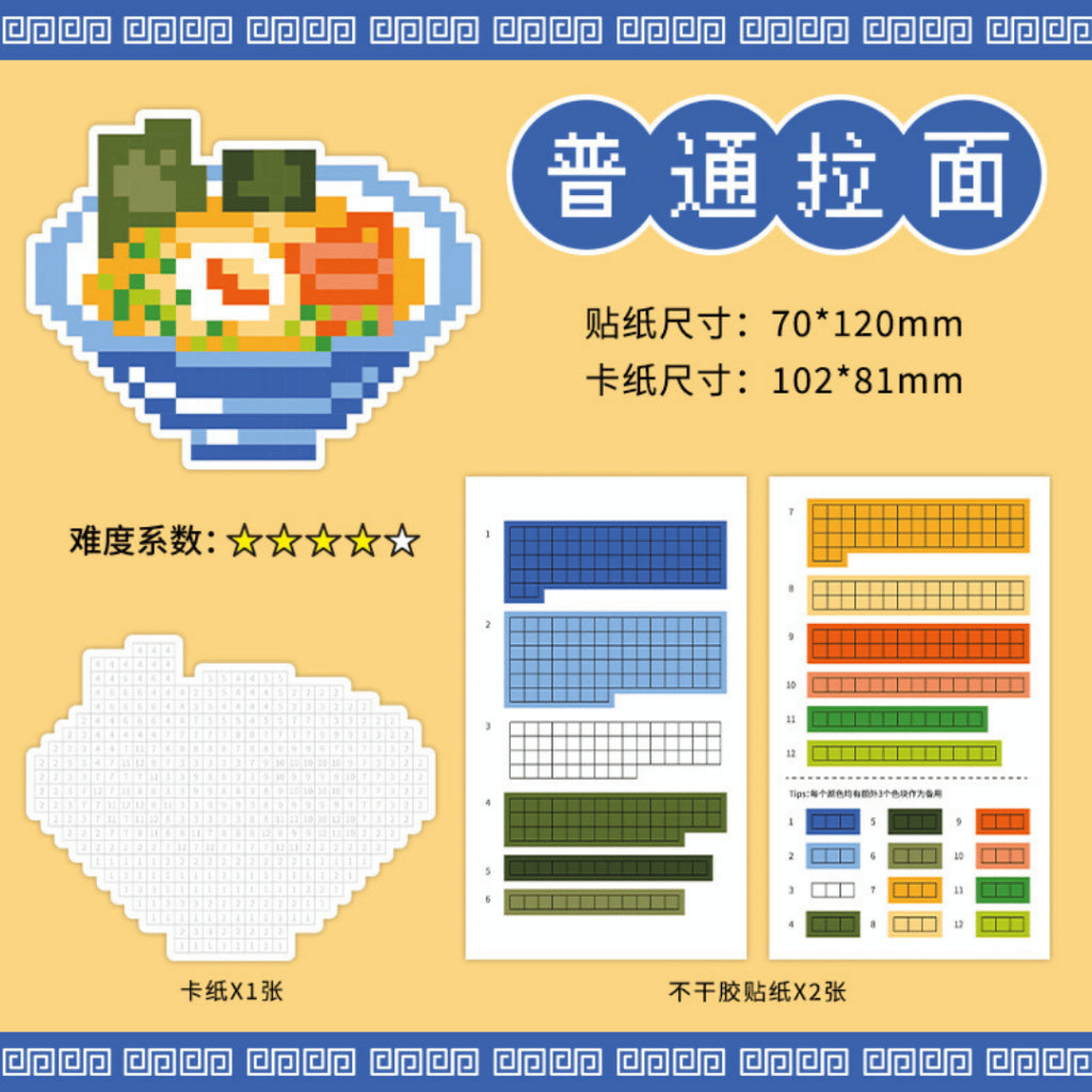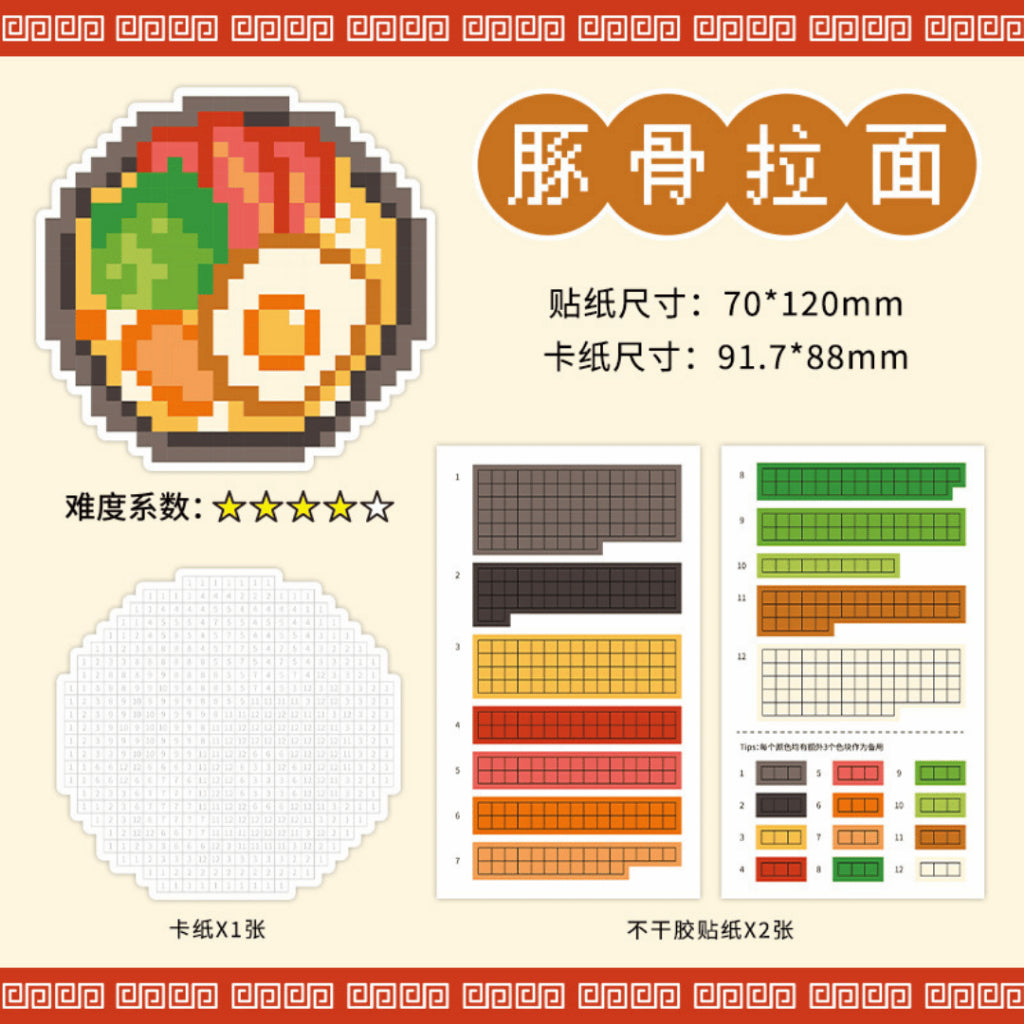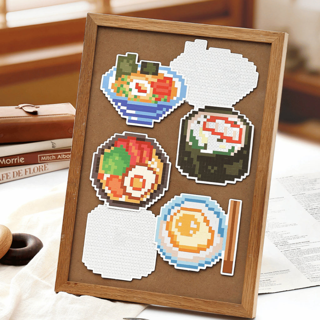 This set includes four pixel-style dishes: Sushi, Pork Bone Ramen, Rice Bowl, and Classic Ramen. Each design comes with a pixel grid board plus matching colour sticker strips so you can craft your own food artwork step-by-step. The result feels like completing a mini digital painting, but in real life!
