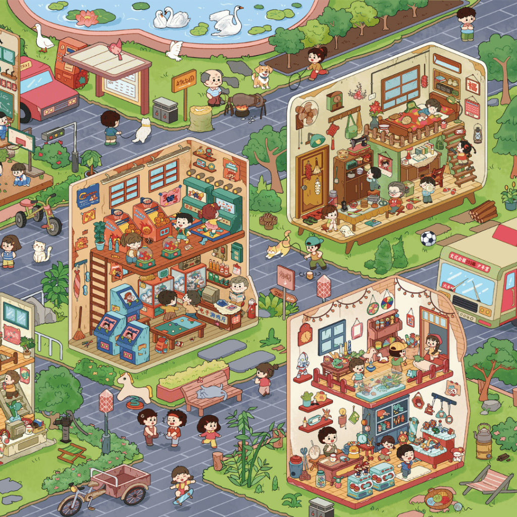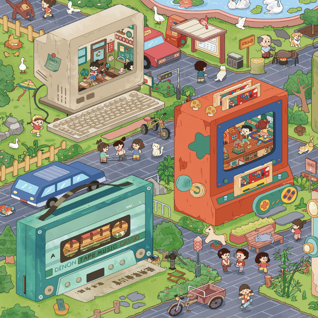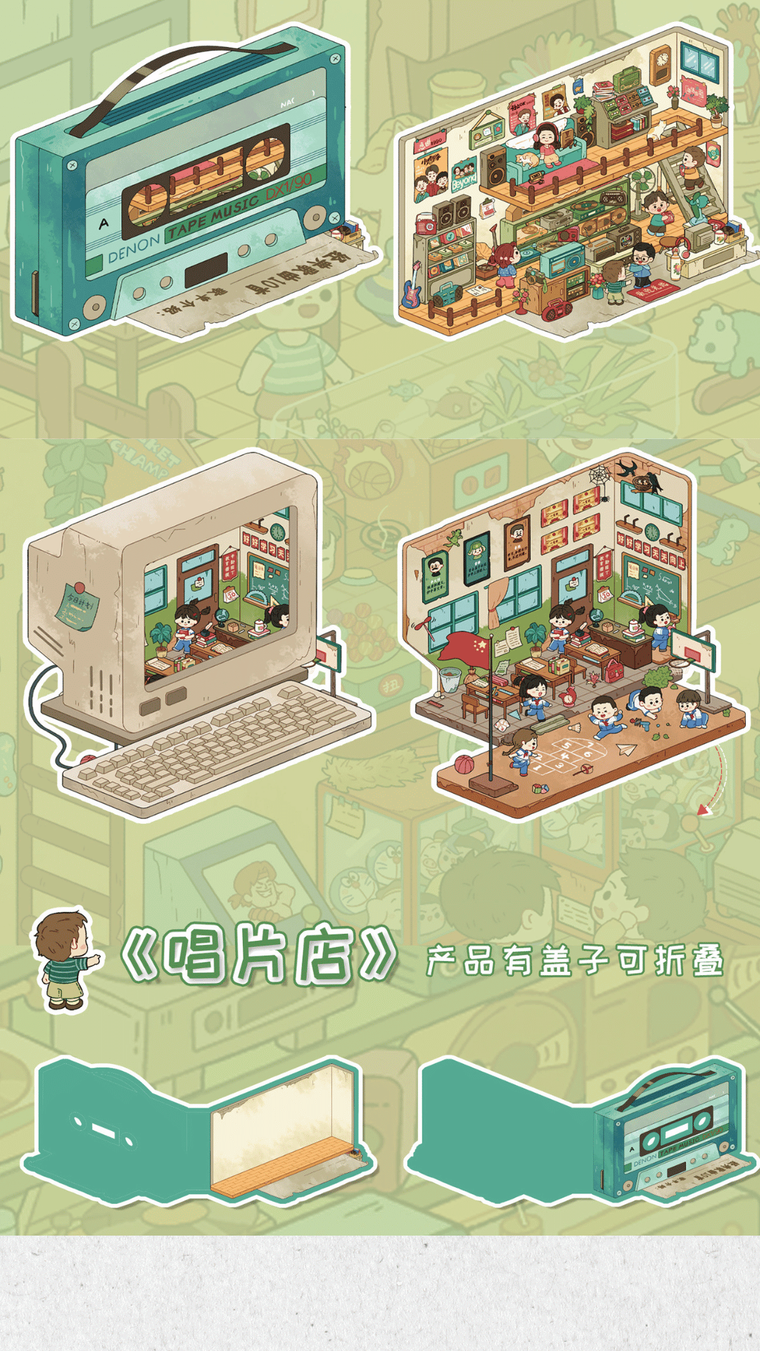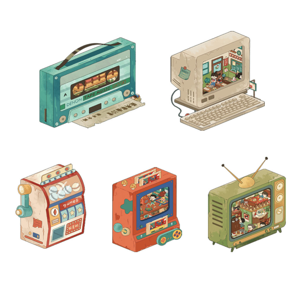 Step back in time with the Retro Forest Town 1.0 Series, a special 5-scene large edition that celebrates nostalgia through intricate storytelling. Each design transforms a retro device — from a cassette player and vintage TV to a typewriter PC and arcade game — into tiny, bustling worlds filled with joyful characters.