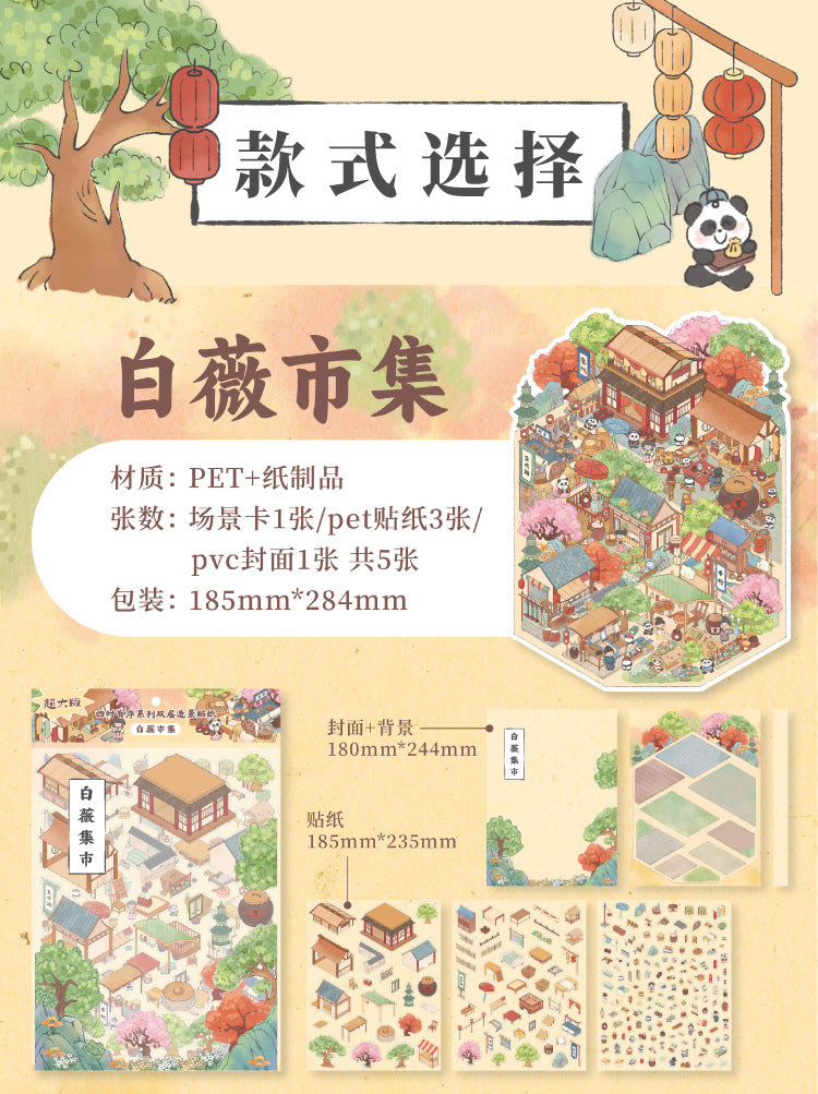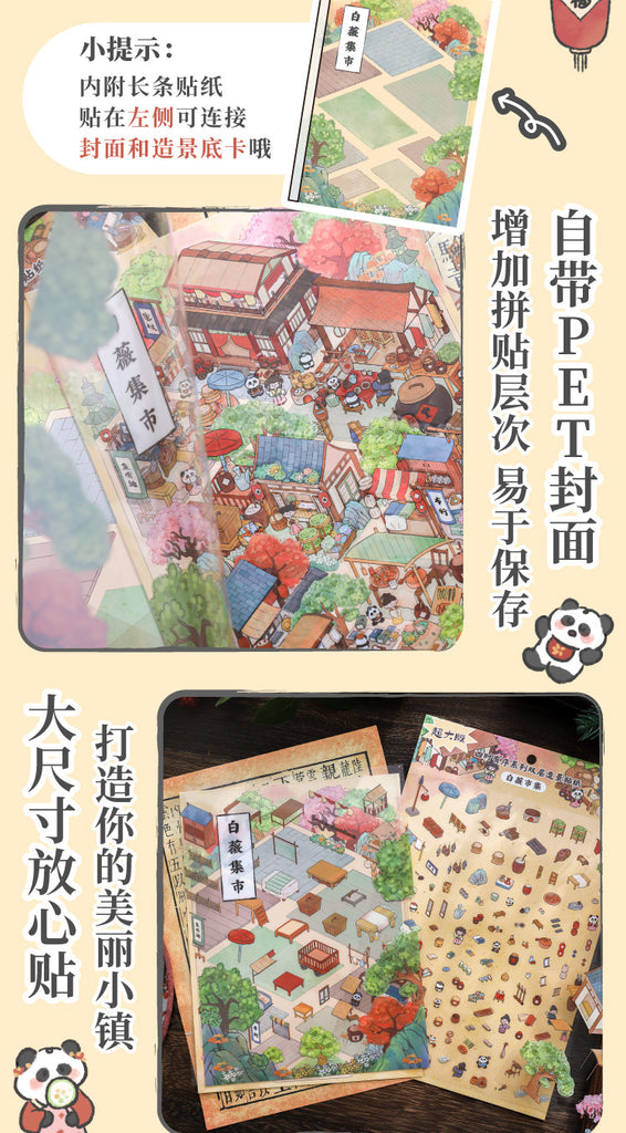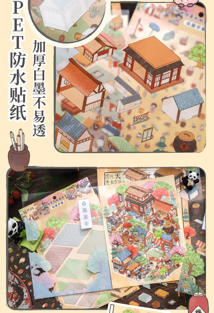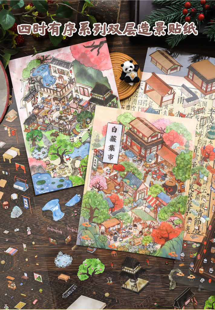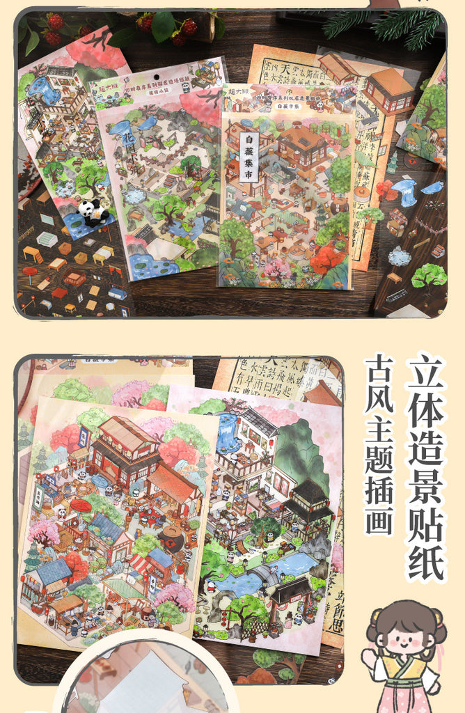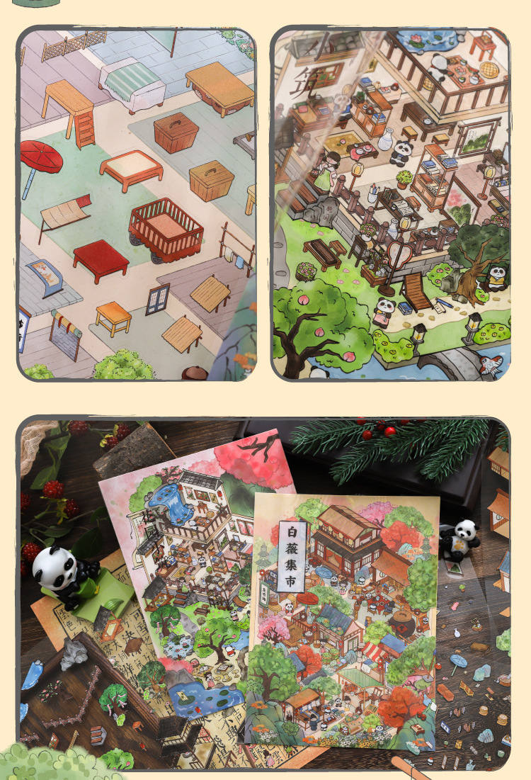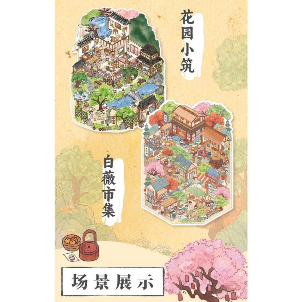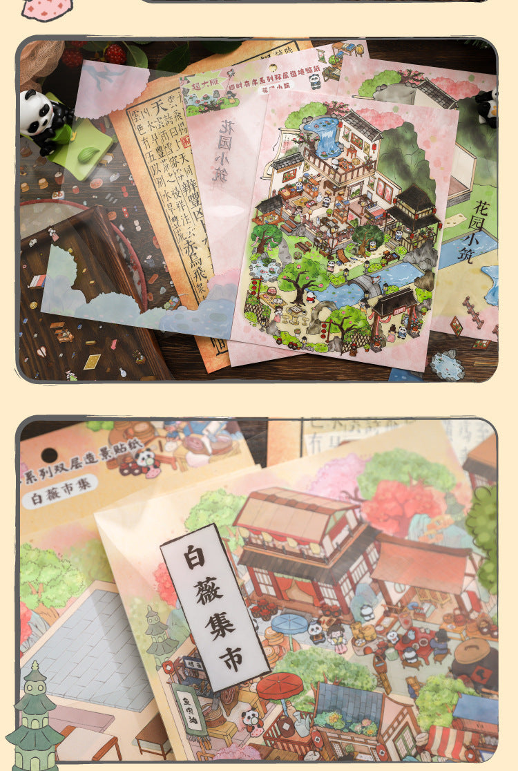 Step into a whimsical world of pandas and ancient charm with these traditional Chinese scene stickers! The White Rose Market bustles with stalls, red lanterns, and springtime trees, while the Garden Courtyard offers a serene waterfall, stone bridges, and tea houses nestled in nature. Each pack is a peaceful escape, perfect for sticker hobbyists, bonding activities, or as a calming puzzle gift for students and teens.